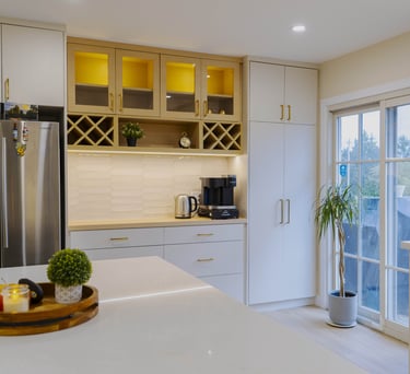 This kitchen is a perfect balance of elegance and function — every wall adds its own story to the space. The bar area exudes sophistication with its warm lighting and refined storage, creating the ideal spot for entertaining. Along the window, the sink and dishwasher are seamlessly integrated, bringing in natural light and everyday practicality. At the center, the deep green island adds a bold touch of character, grounding the design and tying the entire space together in harmony.