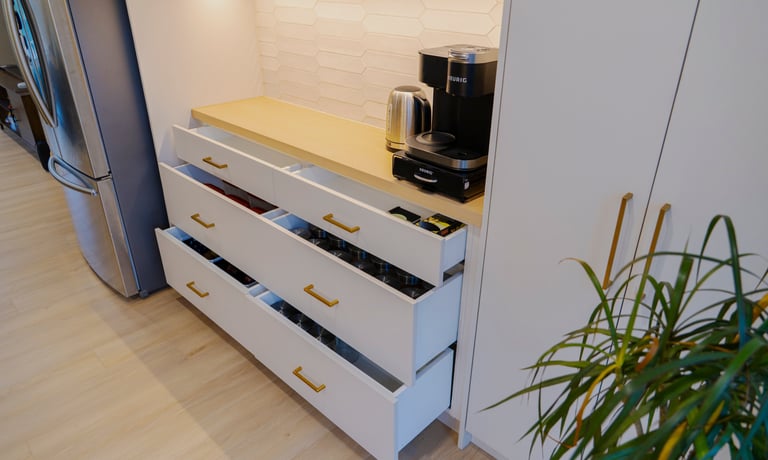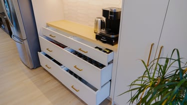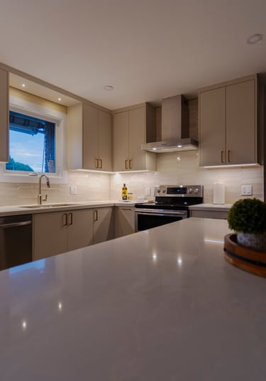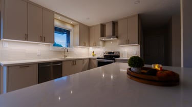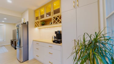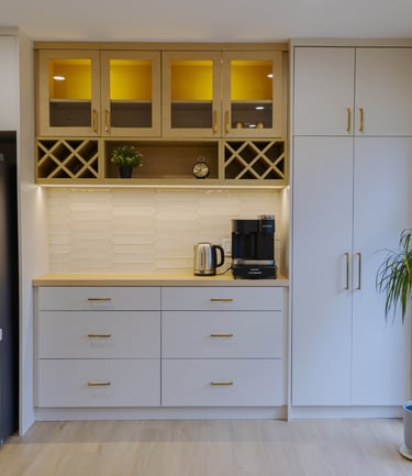The moment you walk into this kitchen, you feel an effortless blend of sophistication and comfort. The space feels calm yet commanding — sleek cabinetry lines draw your eye across perfectly balanced textures and tones. Soft lighting highlights the craftsmanship in every corner, from the seamless joinery to the subtle sheen of premium finishes.
