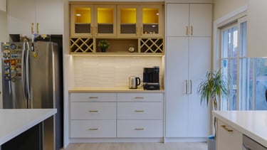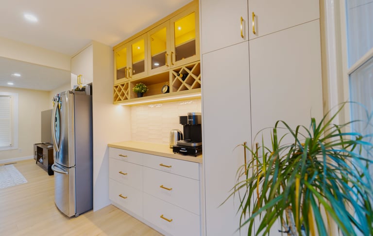 This kitchen is a perfect balance of elegance and function — every wall adds its own story to the space. The bar area exudes sophistication with its warm lighting and refined storage, creating the ideal spot for entertaining. Along the window, the sink and dishwasher are seamlessly integrated, bringing in natural light and everyday practicality. At the center, the deep green island adds a bold touch of character, grounding the design and tying the entire space together in harmony.